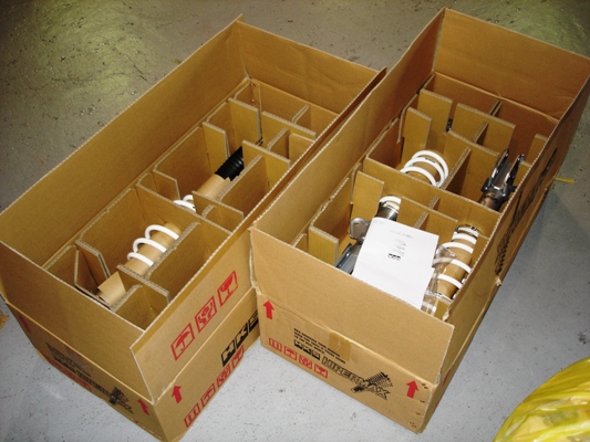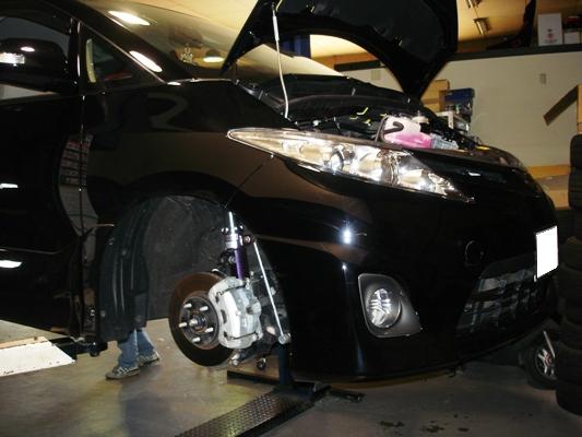エスティマの足廻り交換になります。お客様のご要望で車高をフェンダーにかぶるぐらいセッテ